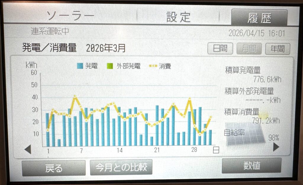 4月以降は、発電量が消費量を上回る「黒字」の季節に入ります。冬の赤字をどこまで取り戻せるか——年間収支という長い視点で、引き続き記録を続けていきます。